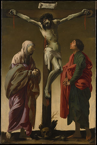 Isus pare că stă pe cruce prin puteri nepământene și nu bătut în piroane. Are un interesant joc de lumini și umbre care străpunge bezna, aduce misticul în prim plan: lumina sfântă emanată de trupul său alături de cea cerească, a Tatălui. Și pictura abundă în norii spre care de fapt ne ridicăm privirea în rugă dar și de apă, simbol multiplu, păgân și creștin, amintită în Biblie la Geneză, botez, spălarea ritualică a viilor și morților, hrană dar și pedeapsa divină a potopului.