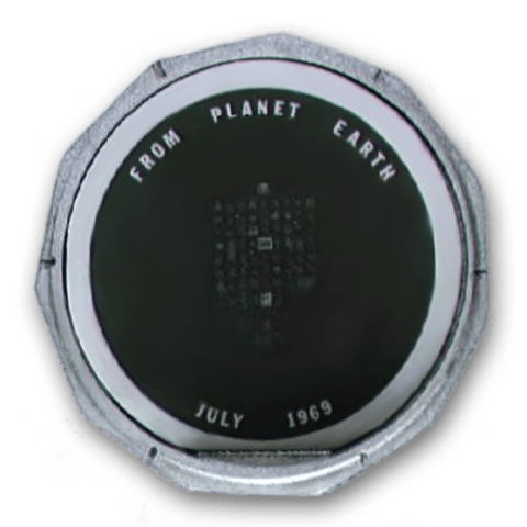 Here Men From The Planet Earth First Set Foot Upon the Moon, July 1969 A.D. We Came in Peace For All Mankind. (Aici Omul De Pe Planeta Pământ A Pus Pentru Prima Dată Piciorul pe Lună, Iulie, 1969, d.Hr. Venim Cu Gânduri Pașnice în Numele Omenirii.)